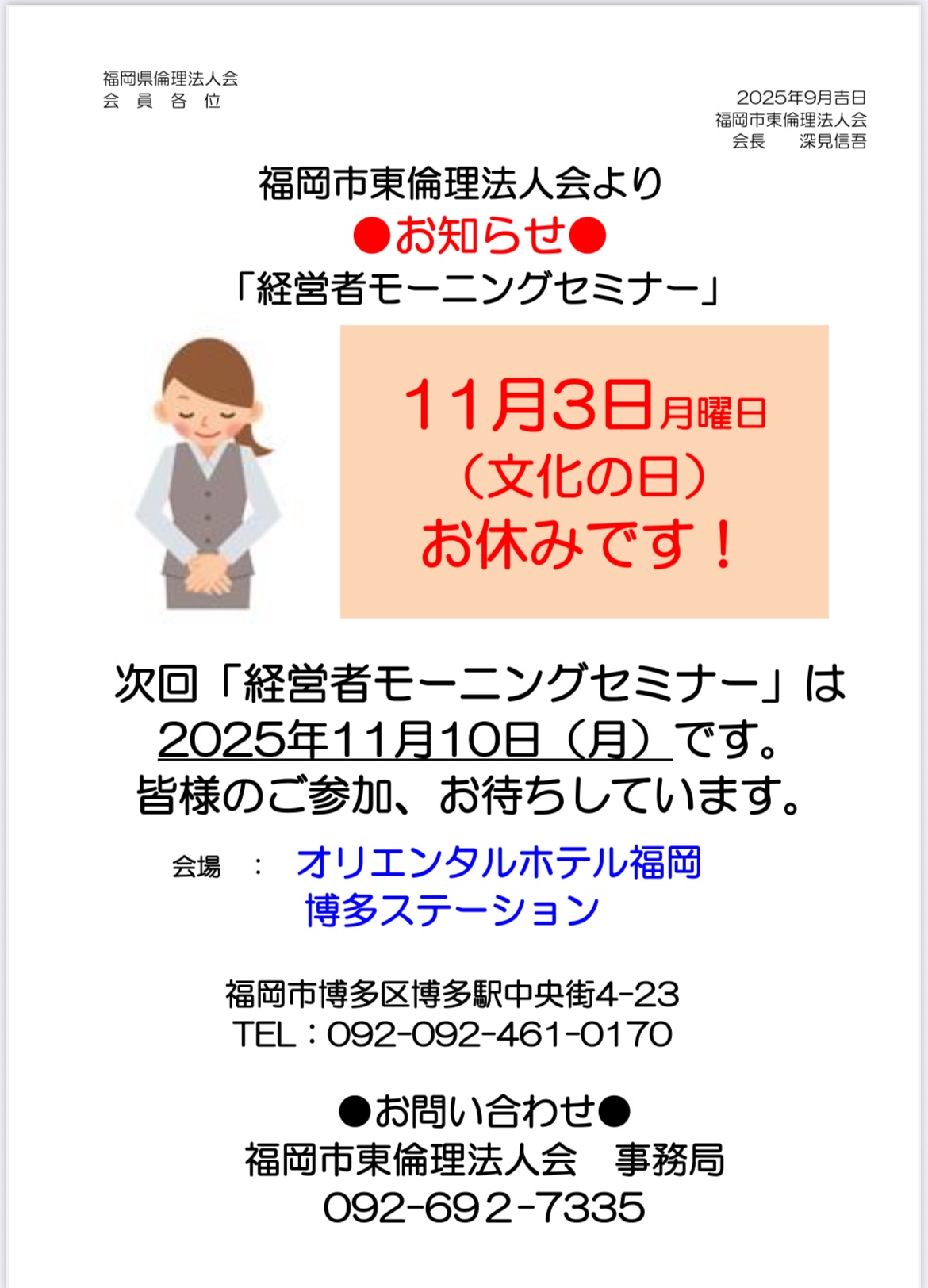 福岡市東倫理法人会 2025年11月3日 文化の日 MSお休み