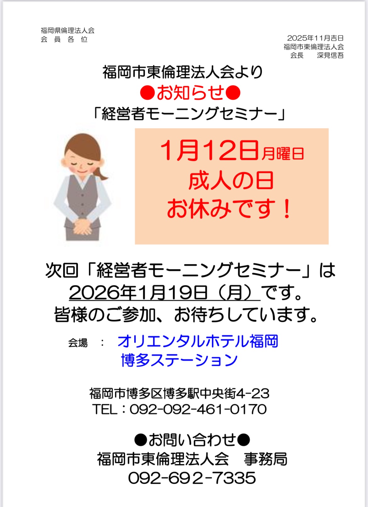 福岡市東倫理法人会 2026年1月12日 成人の日 MSお休み
