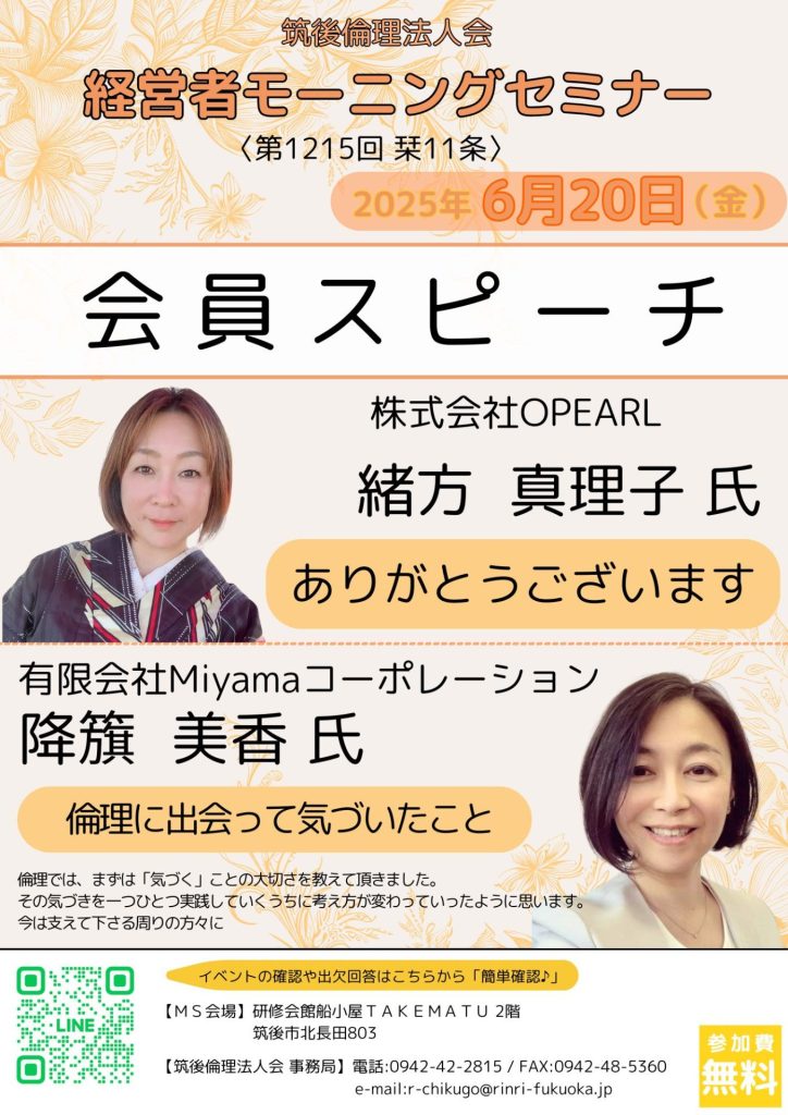 第1215回 経営者モーニングセミナー 筑後倫理法人会 会員スピーチ 株式会社OPEARL 緒方真理子会員/有限会社Miyamaコーポレーション 降籏美香会員
