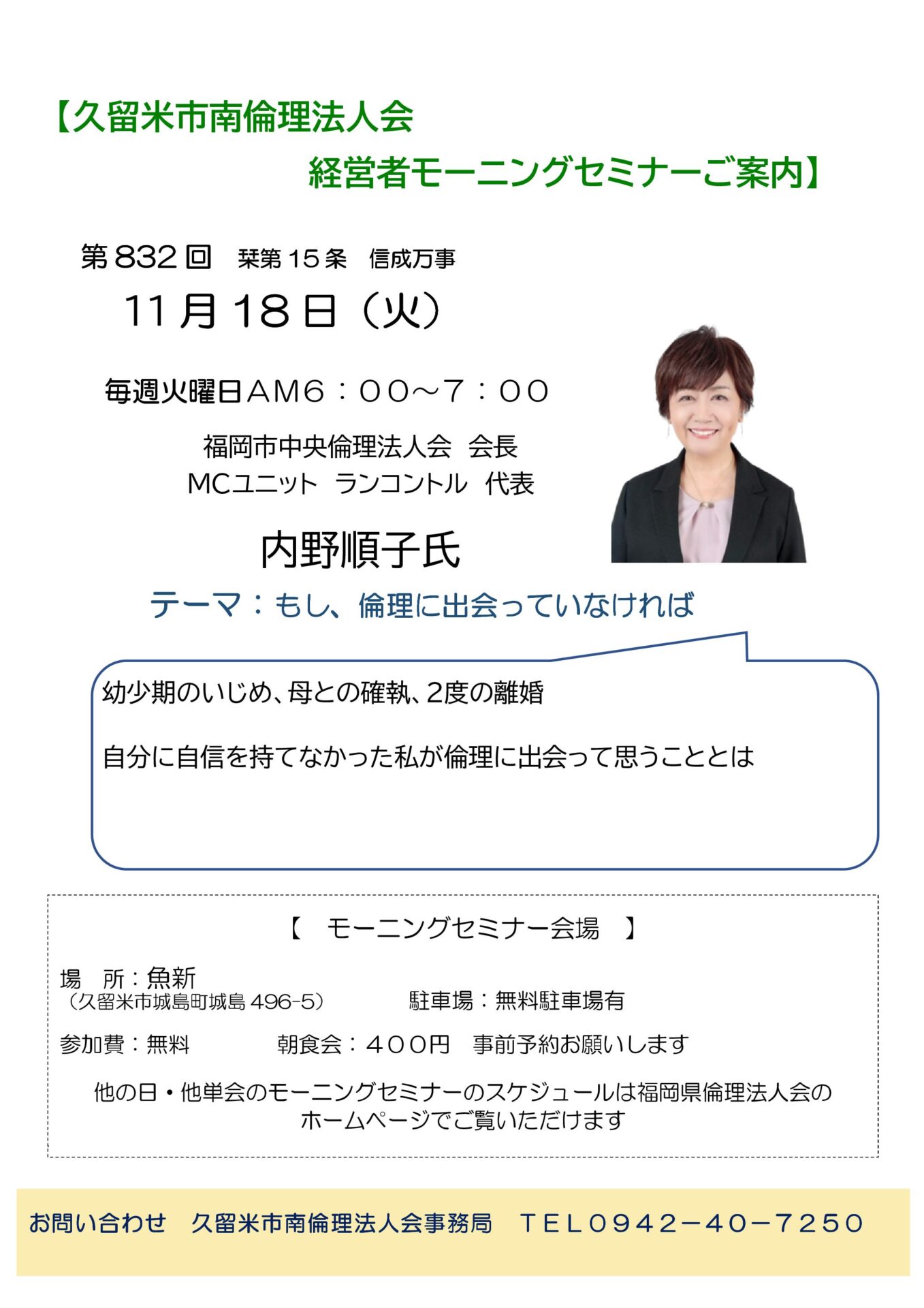 第832回 福岡市中央倫理法人会 会長 内野順子氏