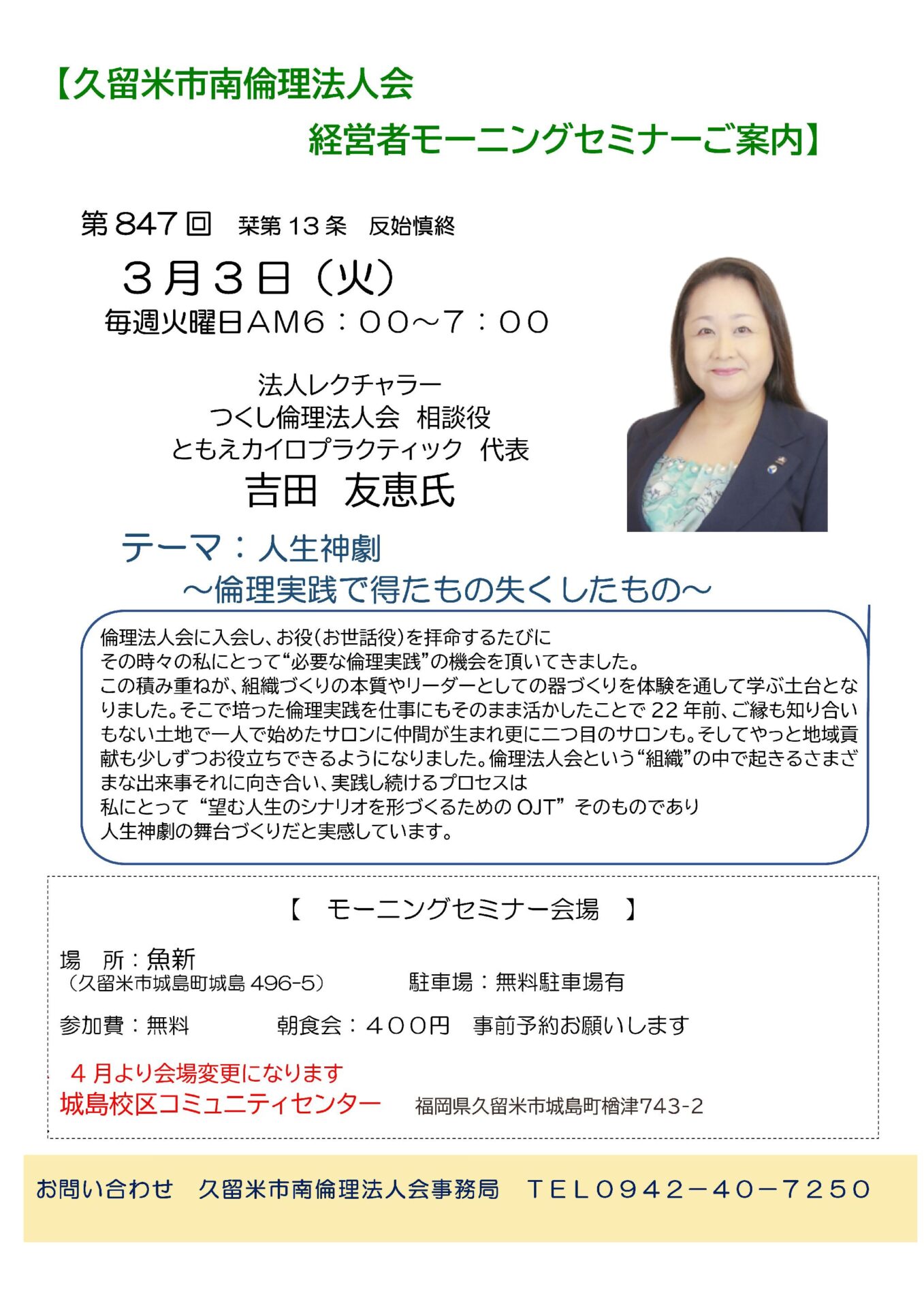 第847回 法人レクチャラー つくし倫理法人会 相談役 吉田 友恵氏