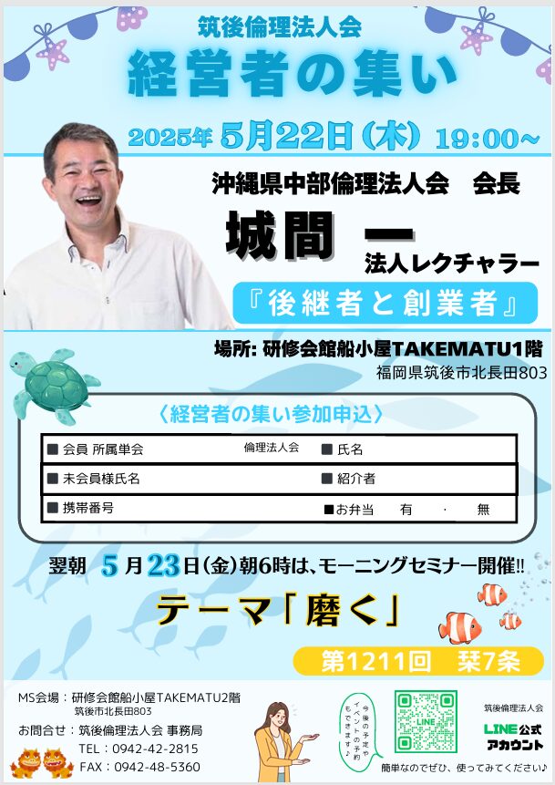 公式LINEへご登録いただき、「5月23日経営者モーニングセミナー」と書いて、次の4つを送信して下さい。当日の飛込み参加も可能ですが、事前にお知らせいただきますと、失礼のない様に対応させていただきます。