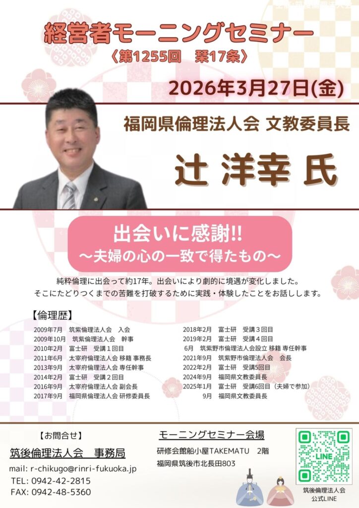 第1255回 経営者モーニングセミナー 福岡県倫理法人会 文教委員長 辻洋幸 氏 「出会いに感謝!!〜夫婦の心の一致で得たもの〜」