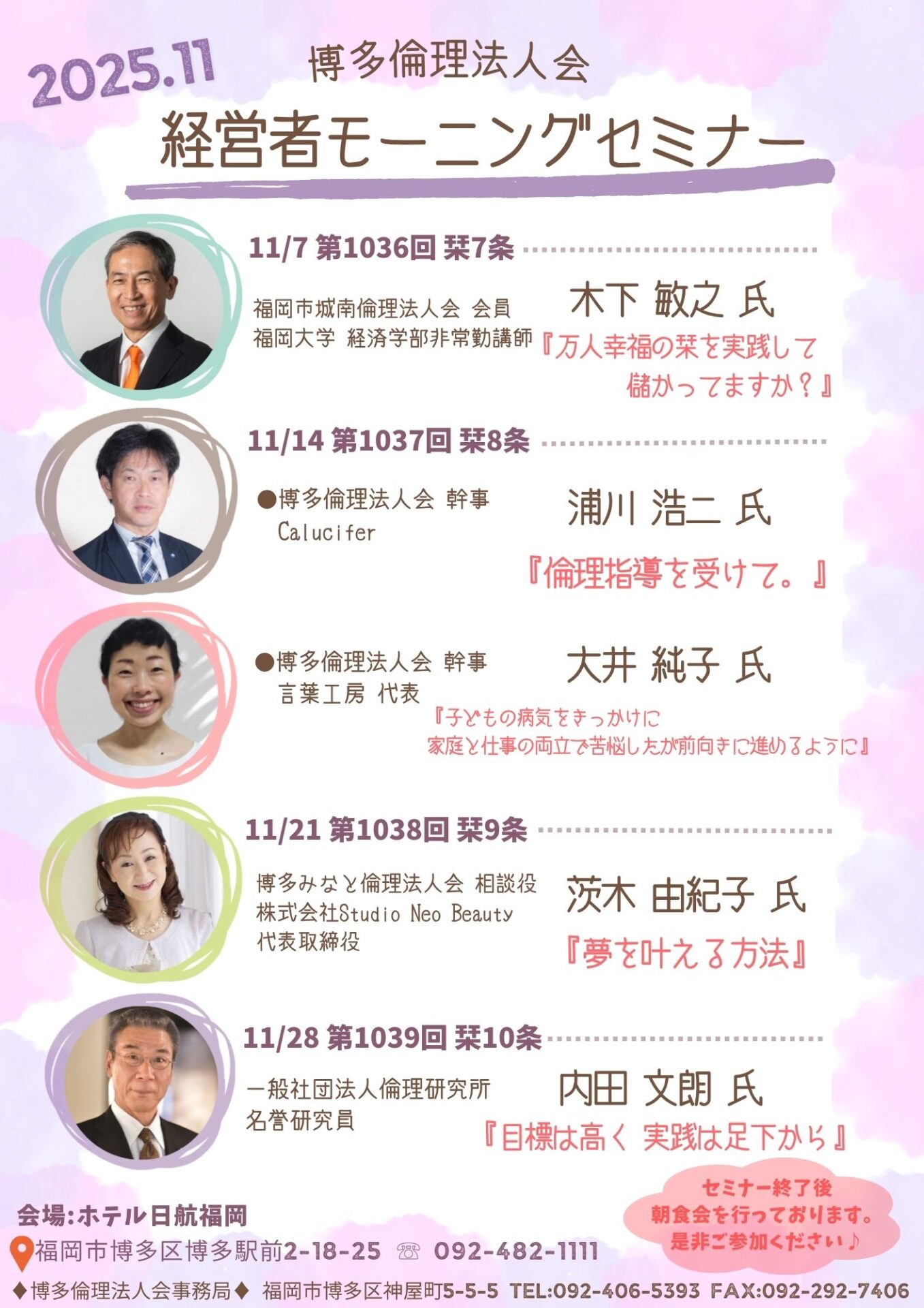 倫理法人会は一般社団法人倫理研究所の法人会員によって組織された会です。倫理経営の実践と普及を目的とし、企業経営者を対象に「経営者モーニングセミナー」等を開催しております。