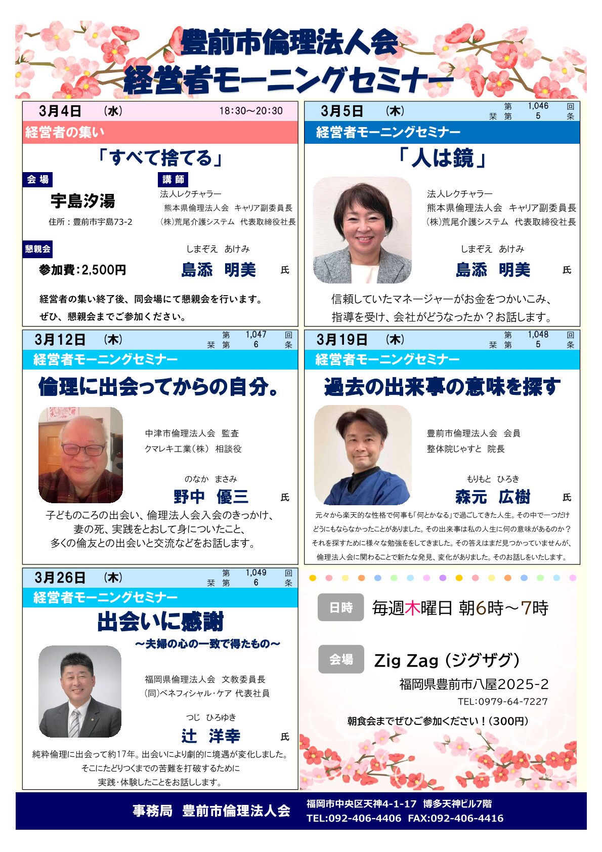 倫理法人会は一般社団法人倫理研究所の法人会員によって組織された会です。倫理経営の実践と普及を目的とし、企業経営者を対象に「経営者モーニングセミナー」等を開催しております。