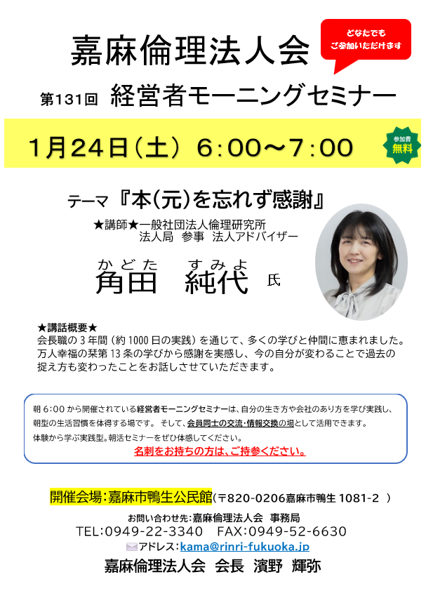 第131回 『本(もと)を忘れず感謝』 福岡県倫理法人会 女性委員長 角田 純代 氏