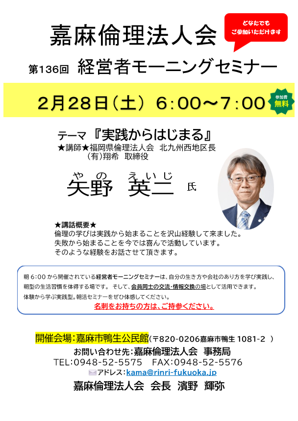 第136回 『実践からはじまる』 福岡県倫理法人会 北九州西地区長 矢野 英二 氏