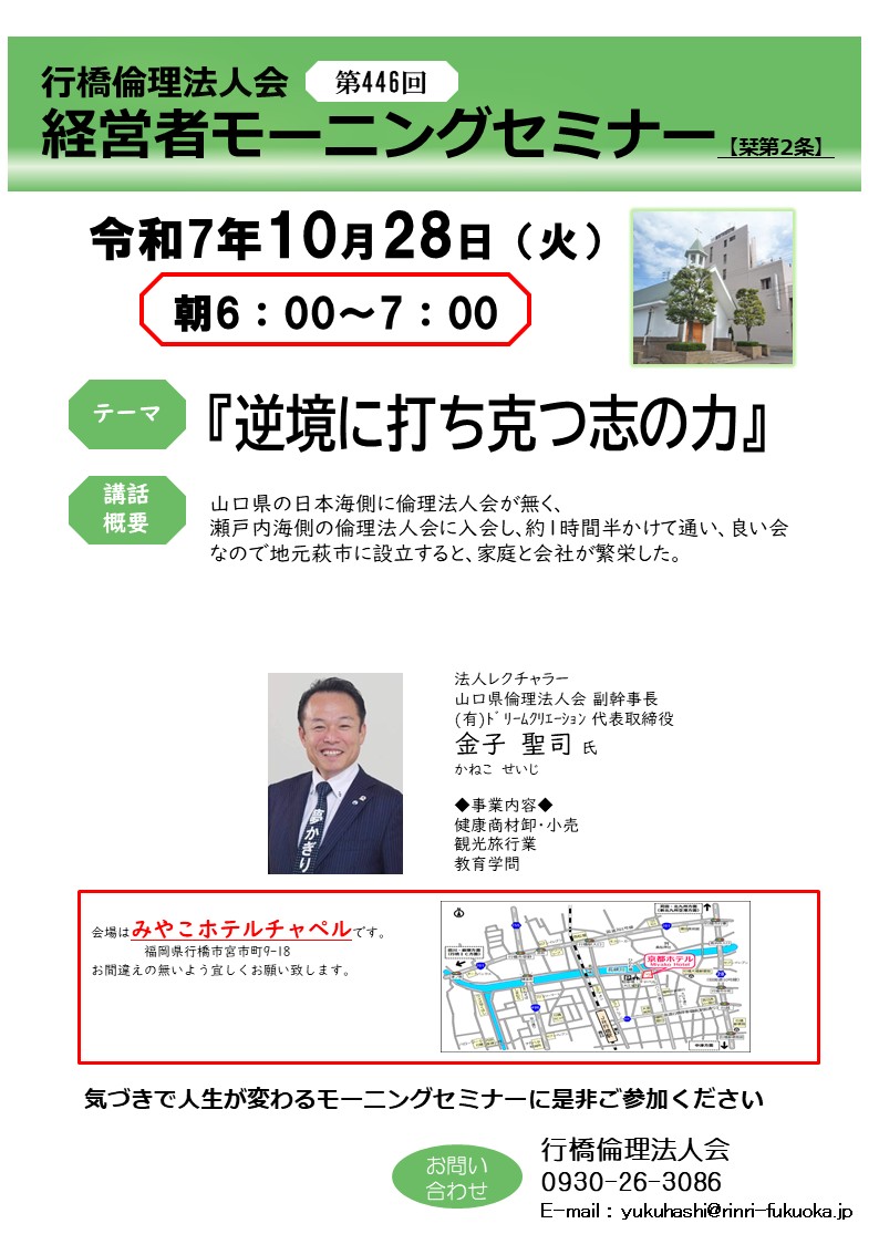 第446回「逆境に打ち克つ志の力」法人レクチャラー 金子 聖司氏