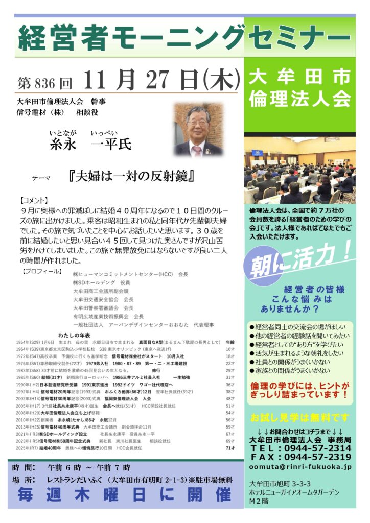 第836回「夫婦は一対の反射鏡」大牟田市倫理法人会 幹事 糸永 一平氏