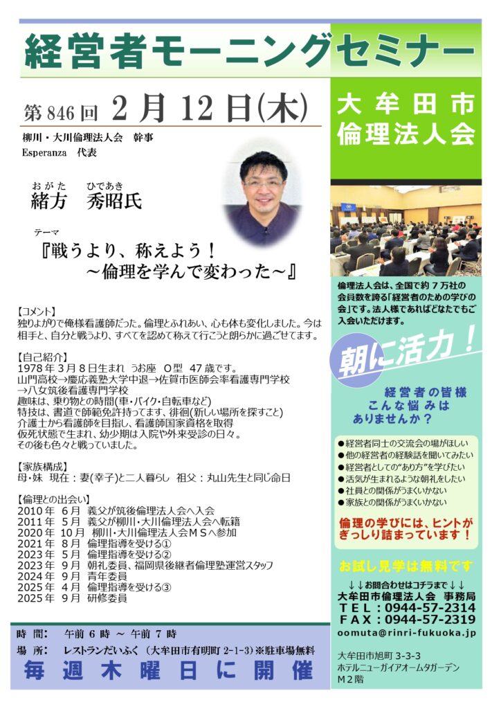 第846回「戦うより、称えよう!~倫理を学んで変わった~」柳川・大川倫理法人会 幹事 緒方 秀昭氏