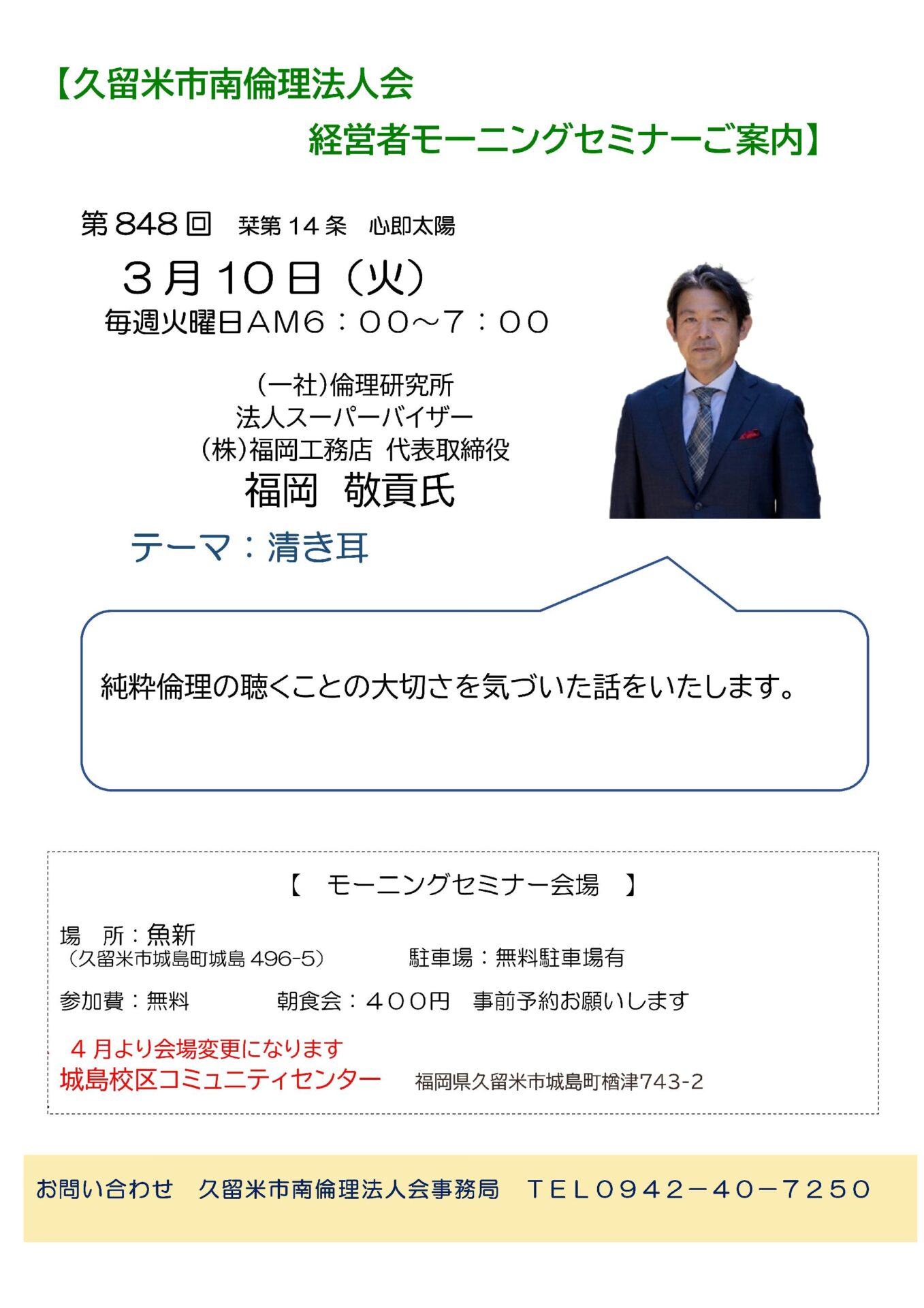 第848回 (一社)倫理研究所 法人スーパーバイザー 福岡 敬貢氏