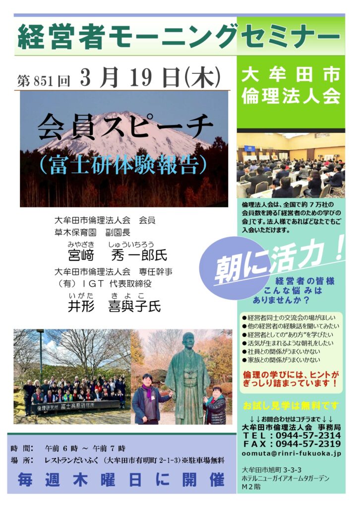 第851回「会員スピーチ(富士研体験報告)」大牟田市倫理法人会 会員 宮﨑 秀一郎氏 /大牟田市倫理法人会 専任幹事 井形 喜與子氏