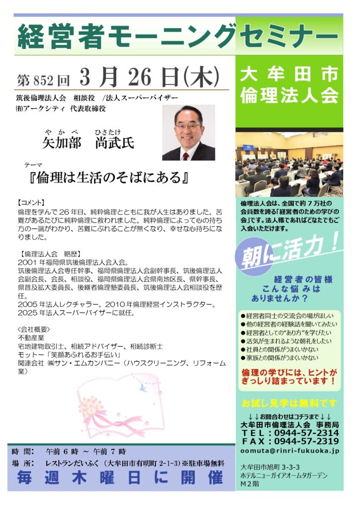 第852回「倫理は生活のそばにある」法人スーパーバイザー 筑後倫理法人会 相談役 矢加部 尚武氏