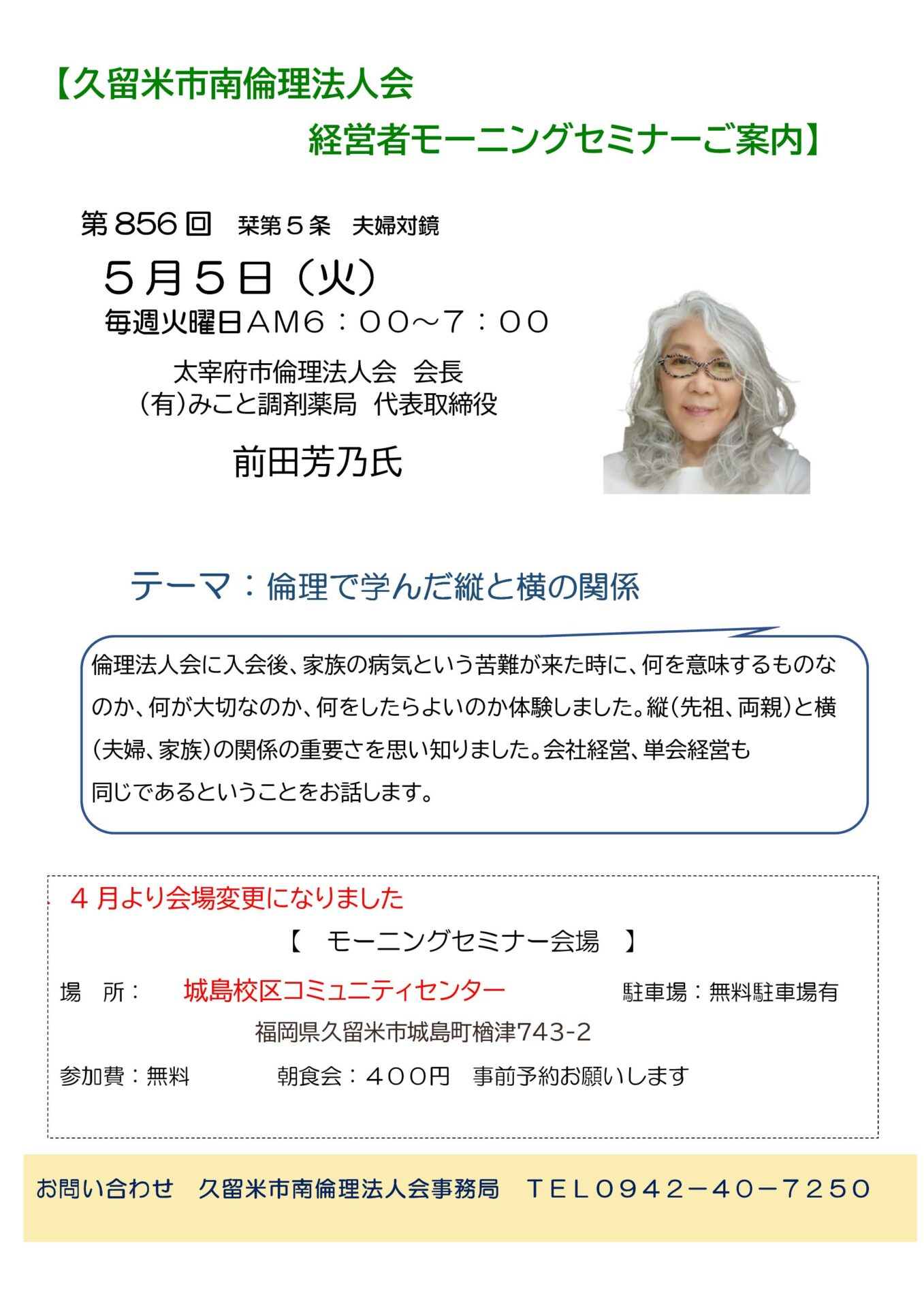 第856回 テーマ『倫理で学んだ縦と横の関係』講師:太宰府市倫理法人会 会長 前田芳乃氏