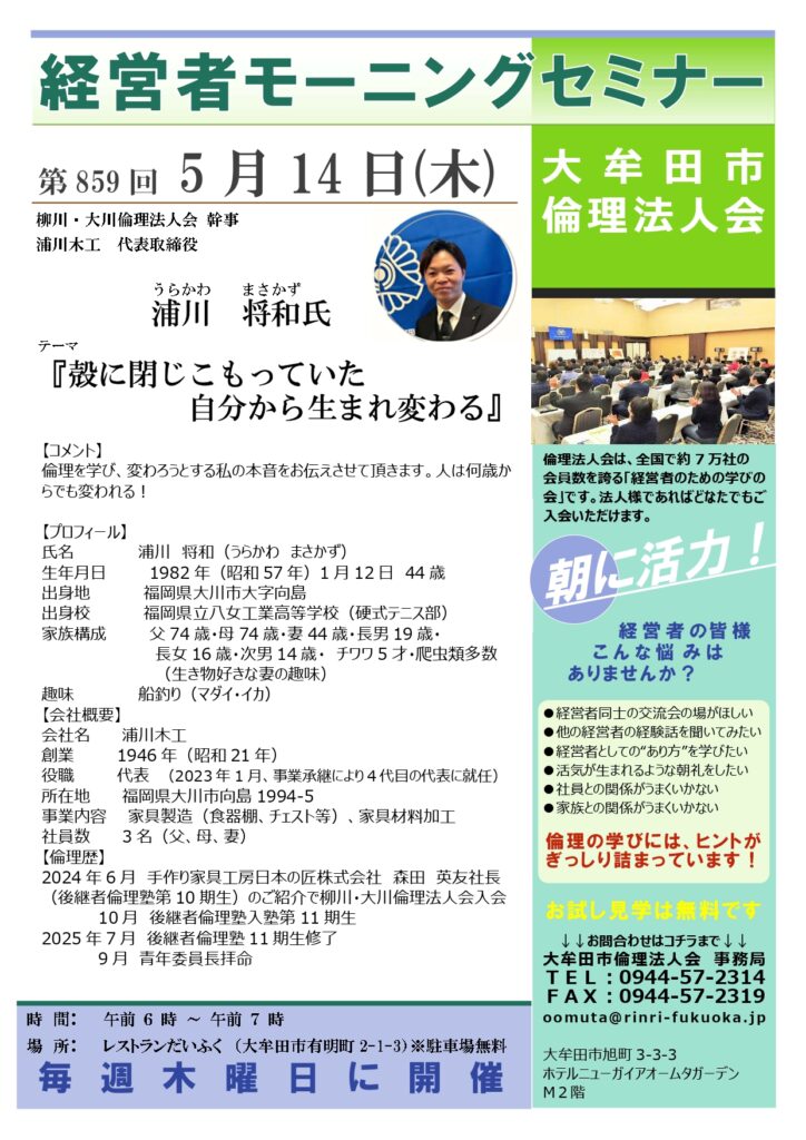 第859回「殻に閉じこもっていた 自分から生まれ変わる」柳川・大川倫理法人会 幹事 浦川 将和氏