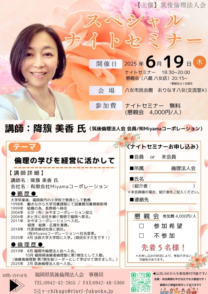 🌛🌛🌛🌛スペシャルナイトセミナー 筑後倫理法人会 会員 降籏美香氏 「倫理の学びを経営に活かして」🌛🌛🌛